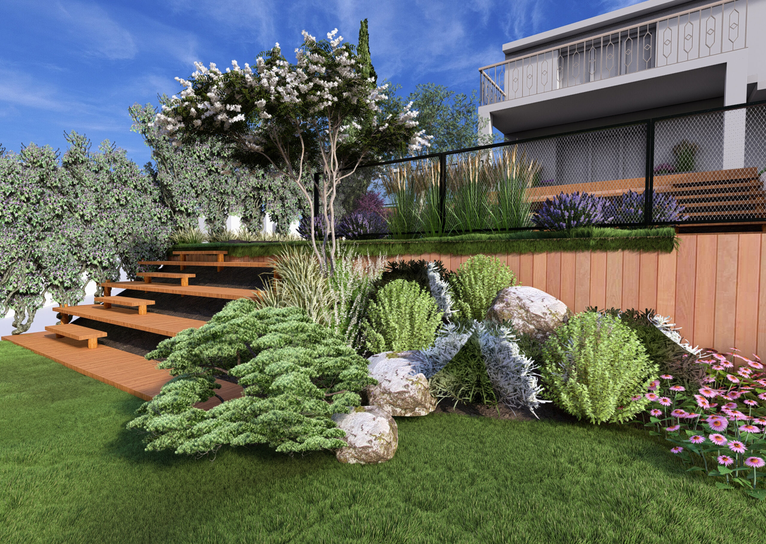 Le jardin s’inspire de l’esprit méditerranéen : une palette végétale soigneusement choisie accompagne les escaliers et vient adoucir les garde-corps.